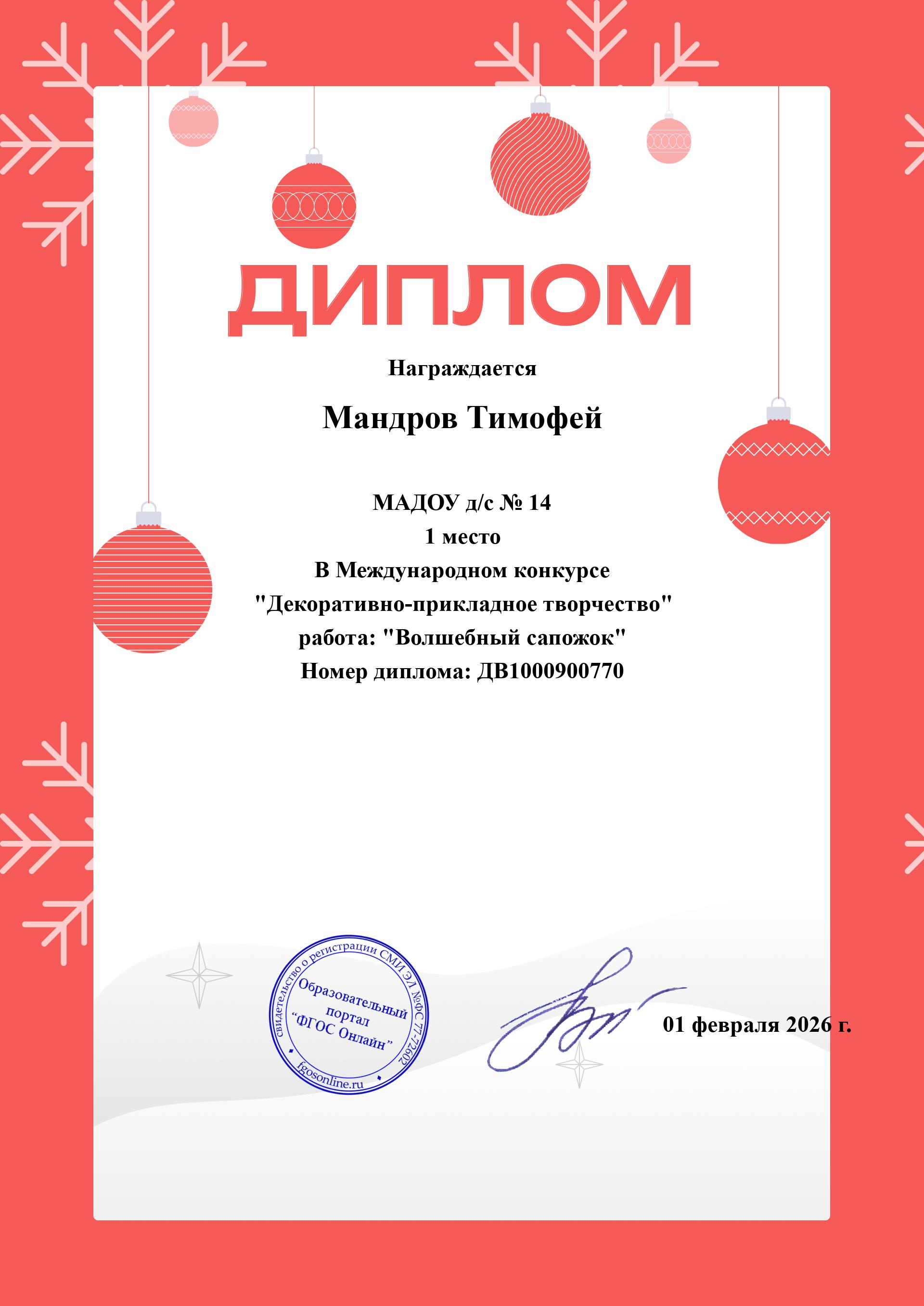 за участие во Международном конкурсе «Декоративно-прикладное творчество: Лепка» с работой «Волшебный сапожок»