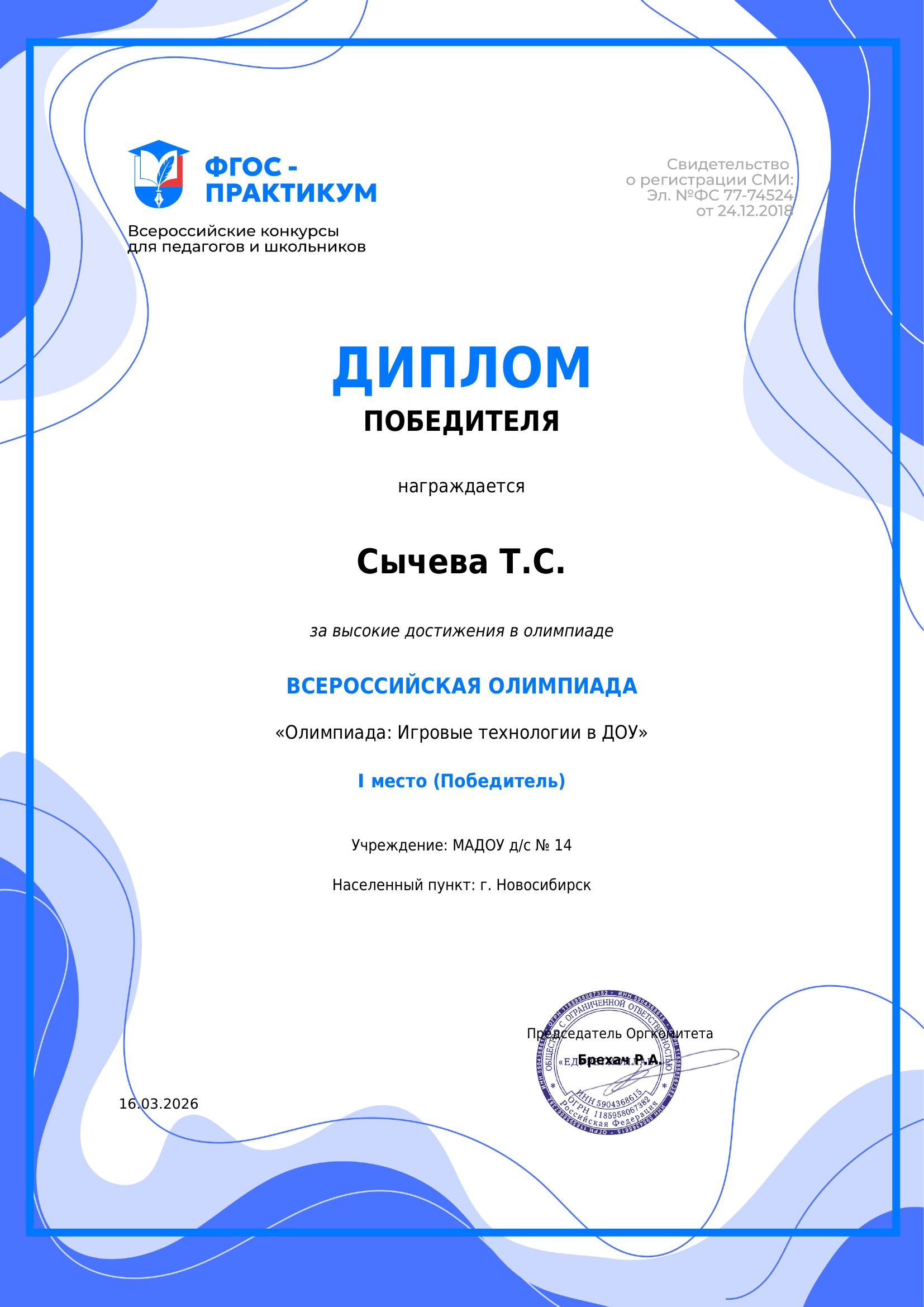 Диплом (I место) за участие во Всероссийской олимпиаде «Игровые технологии в ДОУ»