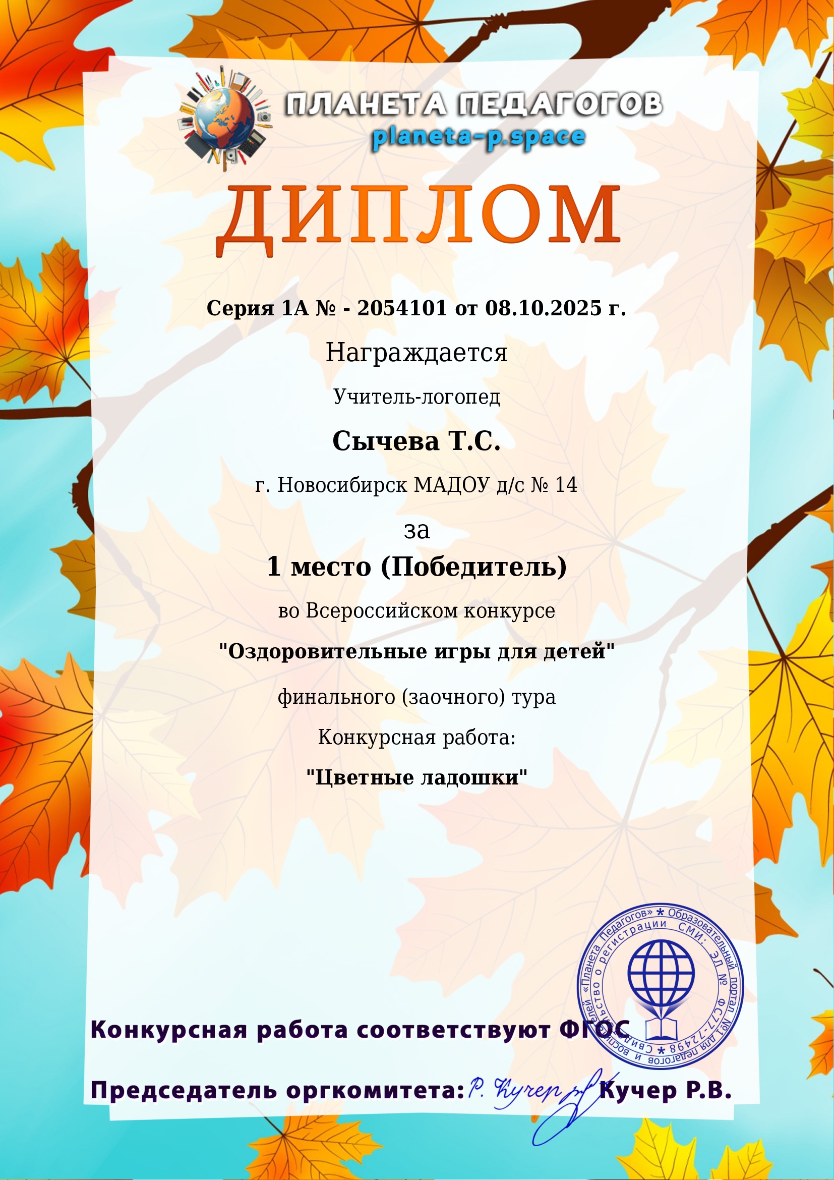 Диплом (I место) за участие во Всероссийском педагогическом конкурсе «Педагогика XXI века: опыт, достижения, методики» в номинации «Коррекционная педагогика». Работа «Особенности логопедической работы при дизартрии»
