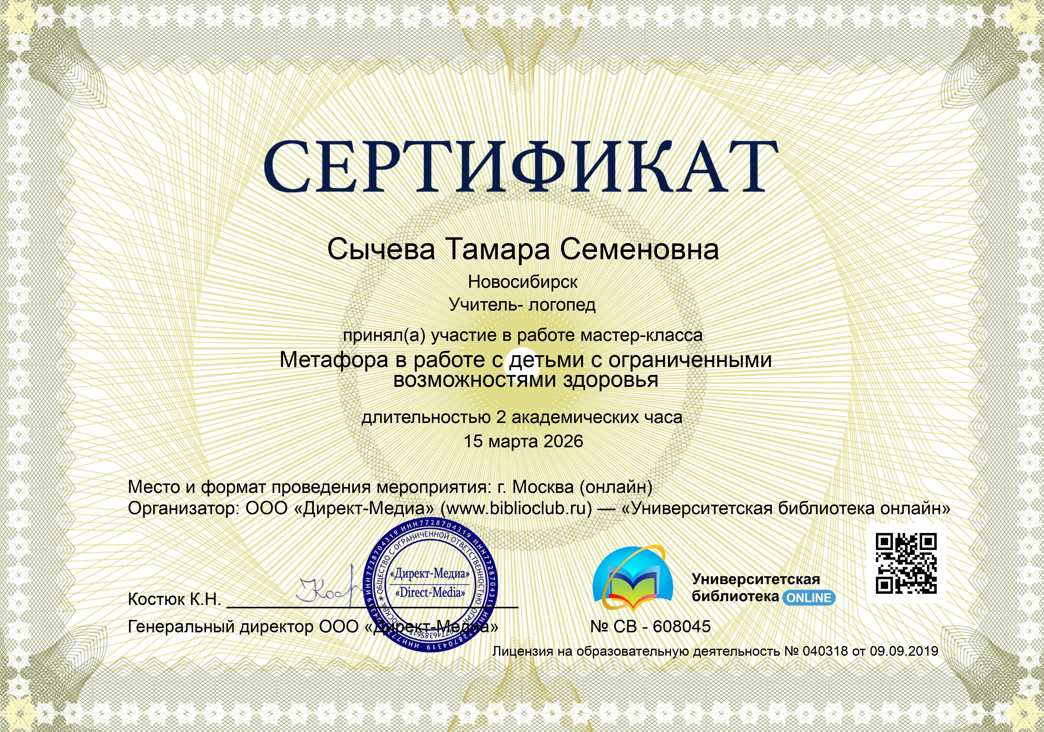 Сертификат за участие в мастер-классе «Метафора в работе с детьми с ограниченными возможностями здоровья»
