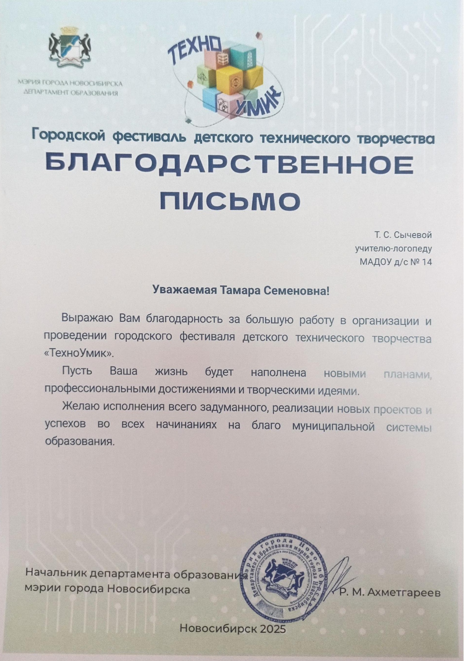 Благодарственное письмо за большую работу в организации и проведении городского фестиваля детского технического творчества «ТехноУмик»